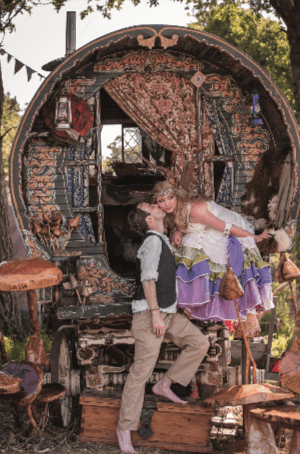 Festival day came, and Peter and I nervously waited in the gorgeous little shepherd’s hunt, which was set out for our honeymoon suite by qualityuneathered.co.uk, complete with a bottle of organic local fizz. He helped me with my wings (a huge bronze vintage pair created by Angela of Fancy Fairy Wings & Things!) and I laid a beautiful garnet gemstone crown on his, dark floppy hair.