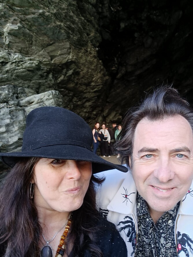 The BBC contacted me and asked if I would like to have a chat and conduct some Merlinesque style spelling with Jonathan Ross for his new TV series on Channel Four, 'Myths and Legends'. The interview was held at one of my favourite caves, Merlin's Cave in Tintagel, Cornwall, and we chatted about Merlin and the alledged shape shifting spell he conducted for Uther Pendragon. After a tad of spell crafting in my Cauldron we then communed with, and honoured the spirits of the Sea together. Jonathon is mostly known for being a comedian, but where real magic is concerned he was genuinely interested and very respectful towards my beliefs, and he really enjoyed shaking my sea spirit shaker to our Blessed Blue Robed Goddess. It was such a pleasure to meet him, check out his new series folks!